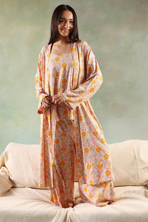 For instance, our easy-to-wear loungewear 3 piece suit for women features an effortless wear with a lightweight printed front-open robe (adorned with a tie-up waist belt). It is paired with a spaghetti-strap slip and matching comfortable trousers. This is when you don't want to put much thought into it, but still look comfortable and stylish.