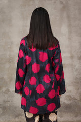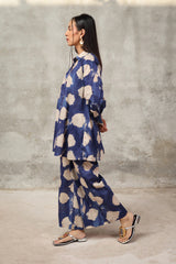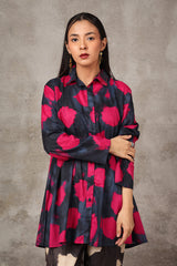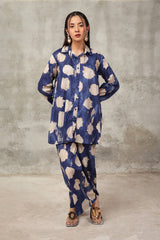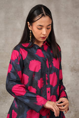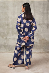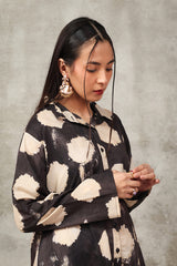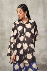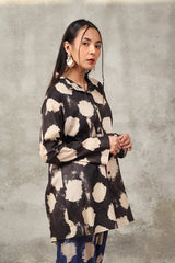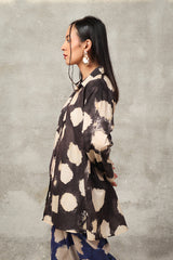 A button-down, loose-fit shirt in a tie-dye style, featuring a band collar neckline. The shirt showcases a vibrant, printed design that adds a bold and relaxed vibe. It can be paired with any generation bottom for a versatile style.