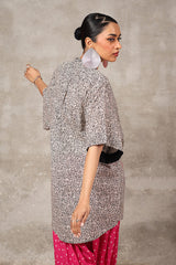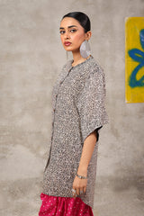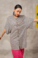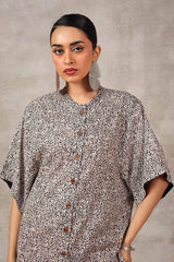 A patterned printed drop-shoulder button-down shirt with a round neckline and muted buttons along the front slit. The shirt features loose-fit sleeves for a relaxed, comfortable fit.