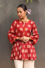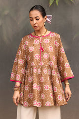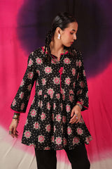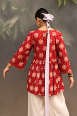 A vibrant Dabu-printed peplum kurta features a round neckline with a V-slit, adorned with buttons and tassels finished with a color-block trim. The sleeve hems are also finished with a matching color-block trim. The gathered waist creates a natural drape, adding to the silhouette’s flow.