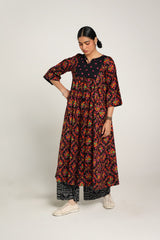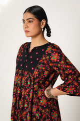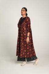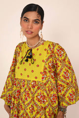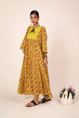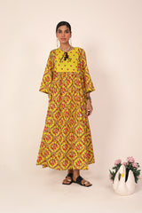 A vibrant Kutch-printed paneled frock, designed with a round neckline and a V-slit adorned with tassel details. The delicately gathered bodice lends a graceful drape, enhancing the fluidity of its flared silhouette.