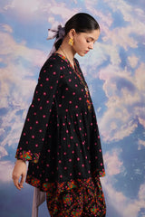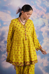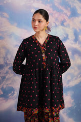 Embodying the essence of Kutch craftsmanship, this printed peplum kurta features a subtle overall print, with intricate Kutch patterns accentuating the V-neckline and front placket. The vibrant geometric and floral prints on the sleeve hems and peplum hem add depth and artistry to the design. The gathers at the empire waist create a graceful drape, enhancing the flattering flow of the peplum silhouette.