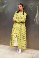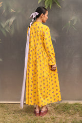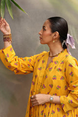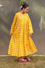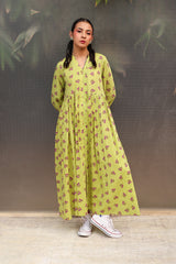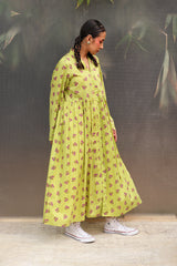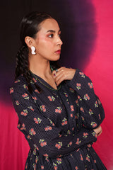 This self-printed frock features a flattering flared silhouette with a V-neckline, enhanced by scattered printed floral motifs. The delicate gathers at the waist create a soft, flowing drape, adding movement and grace to the design.