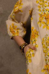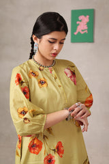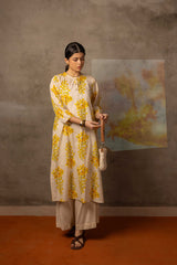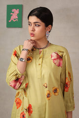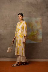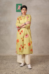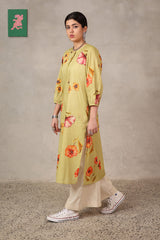 An easy-fit kurta showcases a soft, watercolor-inspired floral pattern. The round neckline with a V-slit is enhanced by an overlapping placket and delicate lace trim, adding fine edges. Finished with a rounded shirt hem, it pairs effortlessly with any generation bottom.