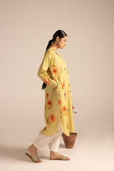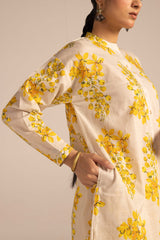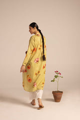 A loose-fit desi floral bloom printed kurta with a band neckline and buttoned front placket. Adorned with soft floral motifs, it features cuffed sleeves and convenient side pockets. Pairs effortlessly with any Generation fit for a sophisticated look.