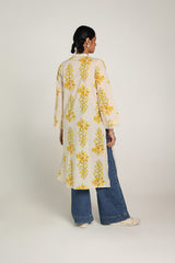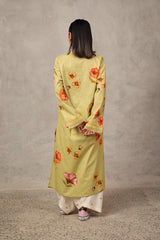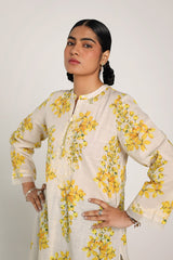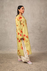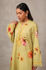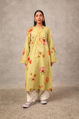 A classic-fit floral printed kurta features a band neckline with a V-slit, accentuated by tassel detailing. The placket is adorned with delicate self-embroidered accents, while the sleeve hems are enhanced with a subtle tissue trim. Can be paired with any GEN bottom for a complete look.