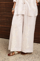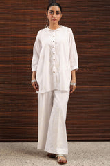 Classic-fit button-down shirt featuring a schiffli band neckline and cuffed sleeve hems. Designed with subtle drop shoulders and a rounded hem for an easy silhouette. Comes with an inner for added comfort and ease. Paired with schiffli culottes.