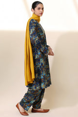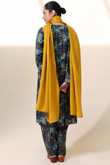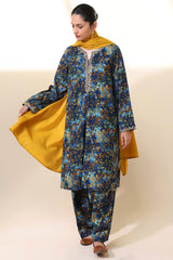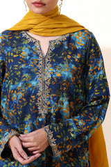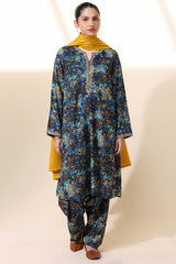 A classic-fit printed shirt with a round neckline and V-slit, adorned with delicate embroidered detailing along the neckline and sleeve hems. Paired with a matching printed classic-fit shalwar.
