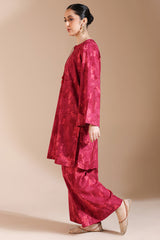 Denim-textured classic-fit printed shirt with a round neckline and V-slit, adorned with tassel detailing. Paired with matching printed culottes.