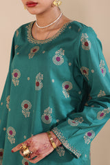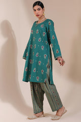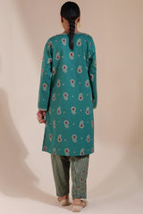 Gold-printed classic-fit shirt adorned with delicate embroidered detailing along the neckline and sleeve hems. Paired with a coordinated printed khula-poncha shalwar.