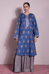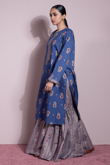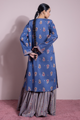 Gold-printed classic-fit shirt with round neckline and V-slit. Paired with a matching gold-printed gharara for statement look.