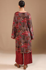 Classic-fit printed shirt with a round neckline and V-slit, adorned with buttons along the front placket. Paired with complementary printed culottes.