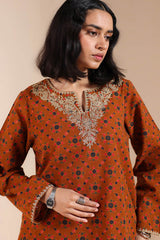 Classic-fit printed shirt with a round neckline and V-slit, adorned with delicate embroidered detailing on the neckline and sleeve hems. Paired with matching printed culottes.