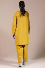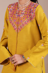 An embroidered shirt with a round neckline and V-slit, adorned with tassel detailing. Finished with delicate stitching along the sleeve hems. Paired with an embroidered khula-poncha shalwar for a cohesive, traditional look.