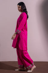 Embroidered paneled shirt with a round neckline and V-slit, adorned with stitching and tassel detailing. The cross-stitch embroidery is enhanced with mirror work, while bead-lace accents finish the sleeve hems. Designed with a rounded shirt hem. Paired with a classic-fit shalwar featuring embroidered detailing along the ankle hemline.