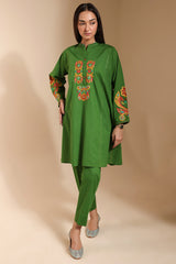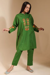 An embroidered paneled kurta with a low band neckline, adorned with colorful stitch detailing and buttons along the front placket. Paired with straight-fit trousers for an elegant, composed look.