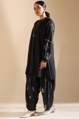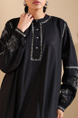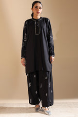 Embroidered classic-fit shirt with a low band neckline and a buttoned front placket. Subtle monotone embroidery elevates the design, complemented by cuffed sleeve hems and a rounded hemline. Paired with an embroidered khula poncha shalwar.