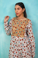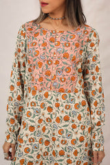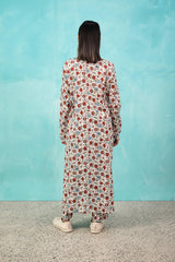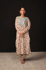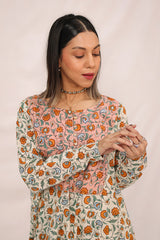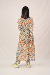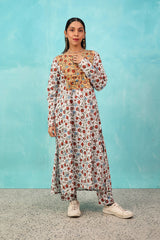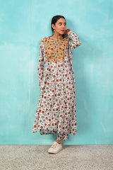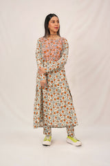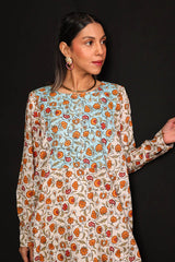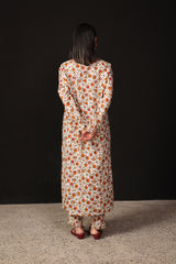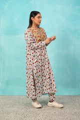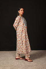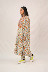 A floral-printed flared shirt with a round neckline adorned with buttons along the front slit. Button detailing on the sleeve hems adds a refined touch. Paired with matching printed straight-fit trousers.