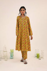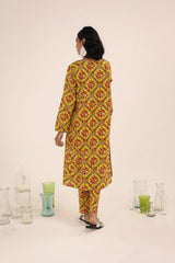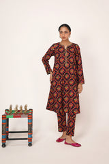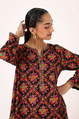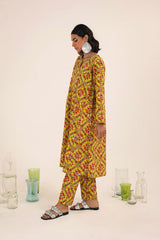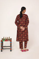 A loose-fit, vibrant printed kurta featuring a round neckline with a V-slit, adorned with intricate embroidered detailing along the neckline and placket. Delicate embroidery also enhances the sleeve hems. Paired with matching printed straight-fit trousers for a coordinated look.