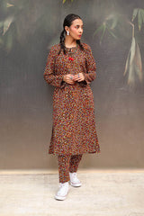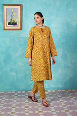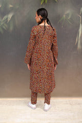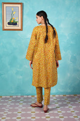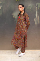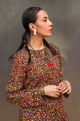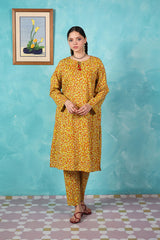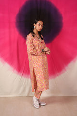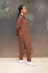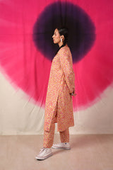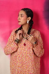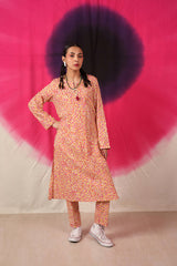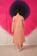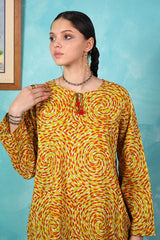 A vibrant spiral-printed classic-fit kurta featuring a round neckline with a keyhole style, enhanced by thread tassel details. Paired with matching printed straight-fit trousers.