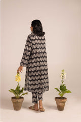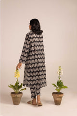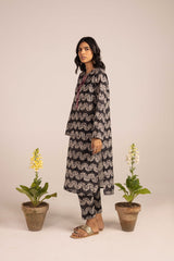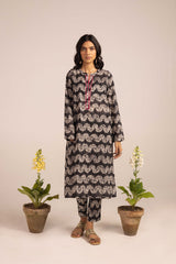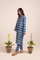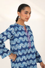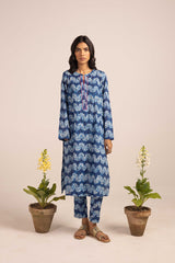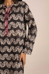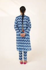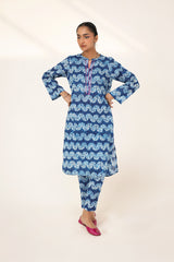 A straight-fit tie-and-dye printed kurta featuring a round neckline with a V-slit. The placket is adorned with delicate popping-colored stitching. Paired with matching printed straight-fit trousers for an effortlessly coordinated, statement look.
