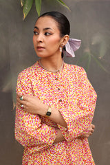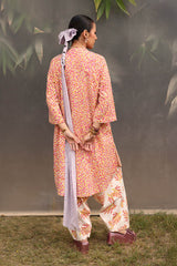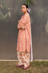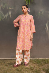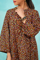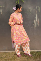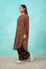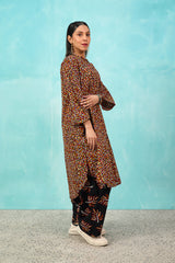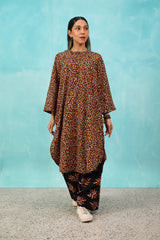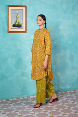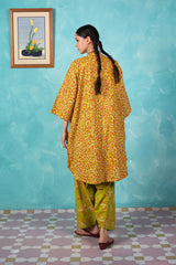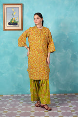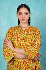 A vibrant spiral-printed kurta featuring a round neckline, a buttoned front placket, and a rounded shirt hem. It is paired with contrasting leaf-printed wide-leg shalwar, adorned with running stitch details along the ankle hemline.