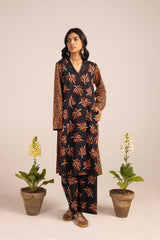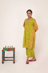 A paneled printed shirt with a V-neckline adorned with button detailing. Paired with contrasting printed culottes.