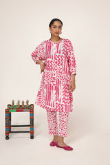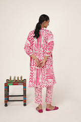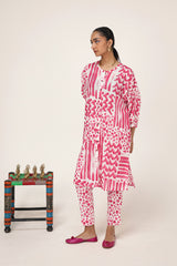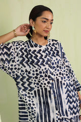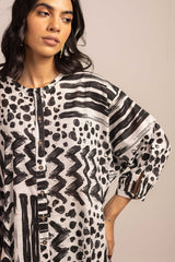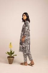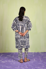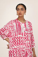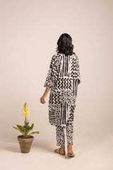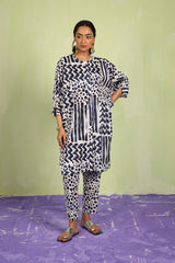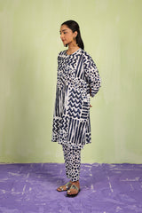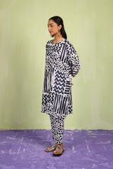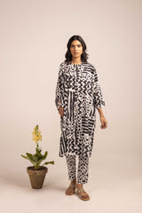 Brushstroke art button-down classic-fit kurta features a round neckline with a front slit, adorned with delicate button details. The cinched sleeves add a structured yet graceful touch. Paired with brushstroke-spot straight-fit trousers, this ensemble merges artistic expression with effortless style.