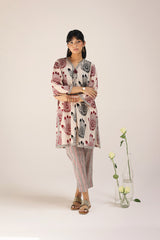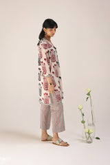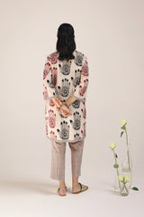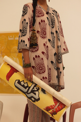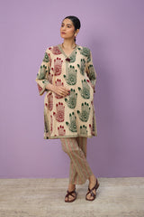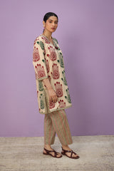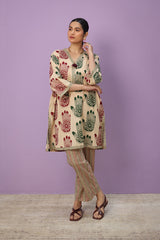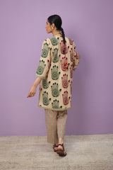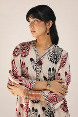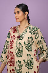 An easy-fit Mehndi printed kurta featuring a V-neckline adorned with tassel detail. The placket, sleeves, and shirt hem are enhanced with contrasting printed borders, adding a striking touch. Paired with coordinated printed classic straight-fit trousers for a cohesive look.