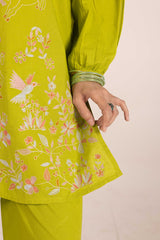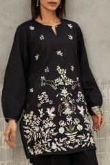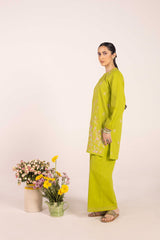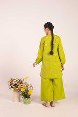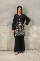 An embroidered classic-fit kurta featuring a round neckline with a V-slit. The neckline is adorned with delicate lace trim and button details. The kurta showcases intricate Gul-o-Waadi pastel embroidery, adding a soft, artistic touch. The cinched sleeve hems are enhanced with fine stitch detailing. Paired with solid-hued culottes for a refined and sophisticated look.