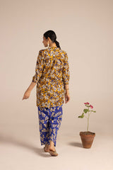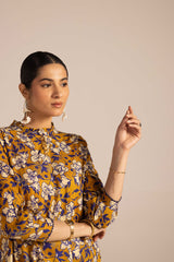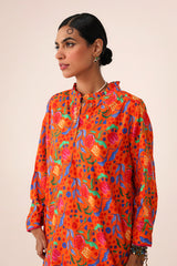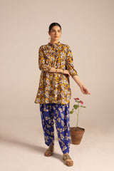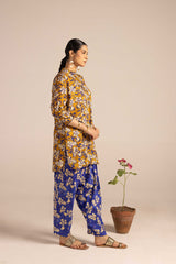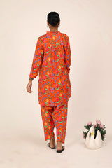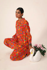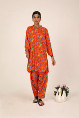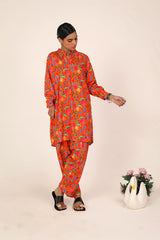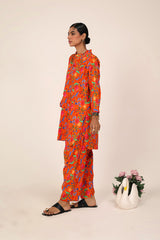 A vibrant printed cord set featuring a kurta with a band neckline and V-slit, adorned with buttons on the front placket. The cuffed sleeve hems are enhanced with delicate lace trim. Paired with matching printed classic fit shalwar.