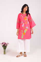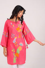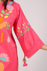A handcrafted, appliquéd kurta with delicate stitching and a round neckline. Vibrant appliqué details bring it to life, while playful tassels on the sleeves add a touch of charm.