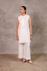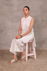 A classic-fit printed shirt featuring a low band neckline with button detailing. Delicate frill accents on the sleeve hems and gentle gathers at the back add a graceful flare to the silhouette.