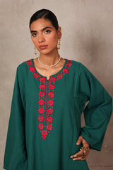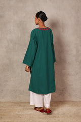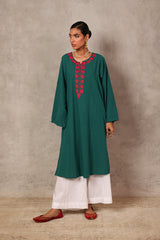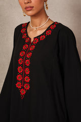 A loose-fit paneled kurta featuring a round neckline, adorned with vibrant color-block floral applique details that extend to the back neckline for a striking touch. The placket is enhanced with delicate dori piping, adding a refined finish to this artful ensemble.