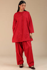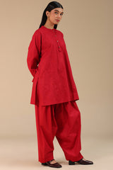 Embroidered classic-fit paneled kurta with a low band neckline and a buttoned front placket. Paired with a classic-fit shalwar, finished with embroidered detailing at the ankle hemline.
