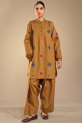 Appliquéd classic-fit shirt on a speckled base, with a low band neckline and a buttoned placket finished with refined stitch detailing. Cuffed sleeves and a soft frill at the neckline, complemented by gentle back pleats for added ease. Styled with a coordinated khula poncha shalwar.