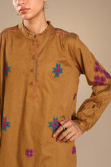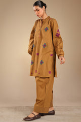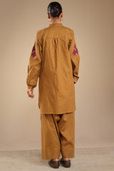 Appliquéd classic-fit shirt on a speckled base, with a low band neckline and a buttoned placket finished with refined stitch detailing. Cuffed sleeves and a soft frill at the neckline, complemented by gentle back pleats for added ease. Styled with a coordinated khula poncha shalwar.