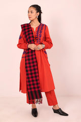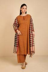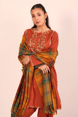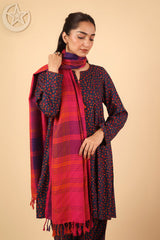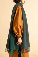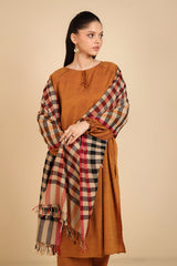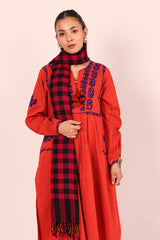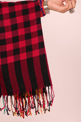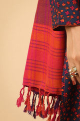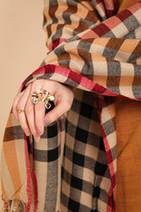 A yarn dyed shawl with woven print details and fringe detail, perfect for pairing with any of your outfits this season.