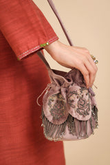 Beaded silk pouch, adorned with cutdana,tassels and hanging beads.