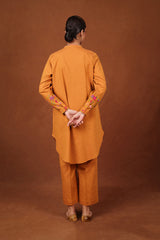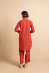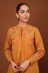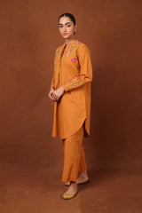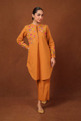 A classic-fit medium- length solid kurta featuring band collar with intricate colourful embroidery and cuffed sleeves hem . Paired with solid colour trousers.