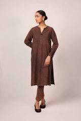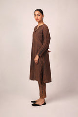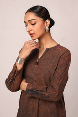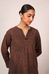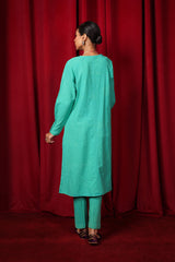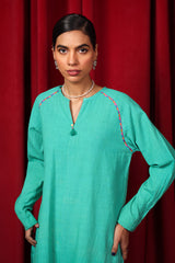 Exuding a laid-back charm, this solid-hued, relaxed-fit kurta features a band round neckline with a V-slit, elegantly adorned with tassel detailing. The vibrant pop of color on the shoulders adds a bold touch to the design. Paired with matching straight-fit trousers, this ensemble combines ease with contemporary flair.
