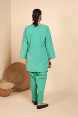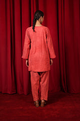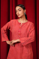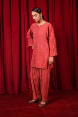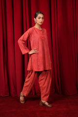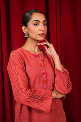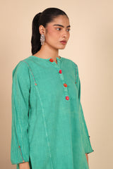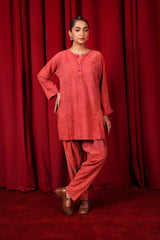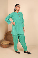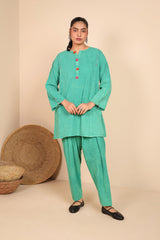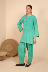 A solid-color co-ord set with a short-panel shirt featuring a round neckline, color-blocked buttons on placket, and stitching details on the shoulders, sleeves, and hem. Paired with classic-fit shalwar for a sleek, coordinated look.