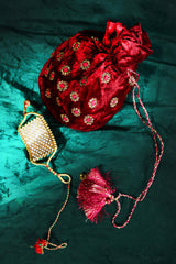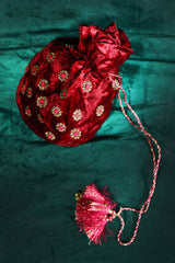 A rich velvet potli adorned with delicate embroidered and bead detailing, finished with braided tassel cords and golden bell accents, a timeless festive essential.