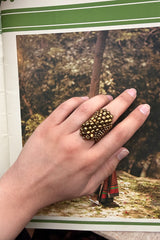 Hand-beaded ring with a geometric flower motif.