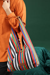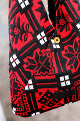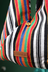 Crafted from rich woven fabric, this statement bag blends texture and color with button detailing, making it a versatile everyday essential with a touch of artisanal charm.