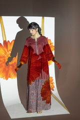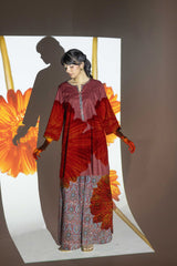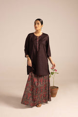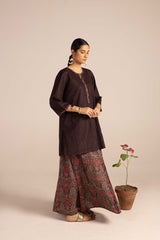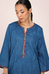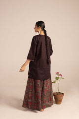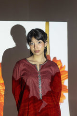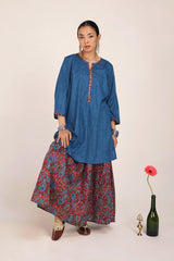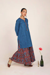 A classic-fit kurta inspired by traditional Ajrak, featuring a round neckline adorned with a vibrant printed placket and sleeve hems. The delicate detailing on the placket adds a refined touch. Paired with a pure Ajrak art classic skirt, this ensemble beautifully merges heritage with effortless style.
