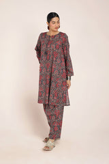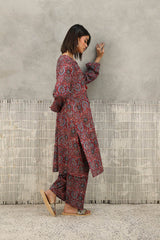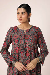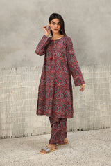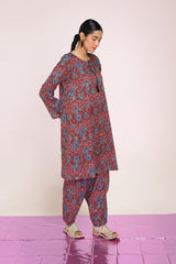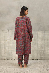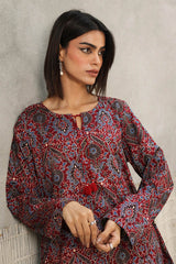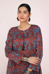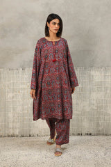 A classic-fit Ajrak-inspired kurta featuring a round neckline with a V-slit, adorned with delicate tassel detailing. The intricate prints celebrate heritage, while the matching classic-fit shalwar completes the timeless look with effortless charm.