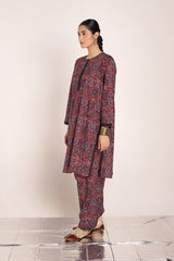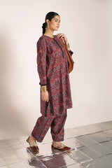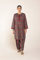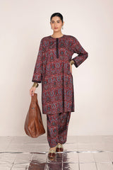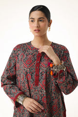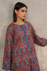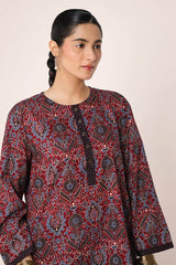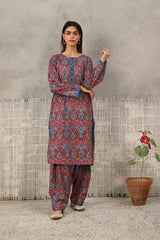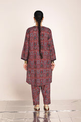 A classic fit Ajrak-inspired printed kurta featuring a round neckline, adorned with age-old geometric motifs and rhythmic symmetry. The placket, sleeve hems, and side slits are highlighted with vibrant borders. Paired with a matching printed classic-fit shalwar.