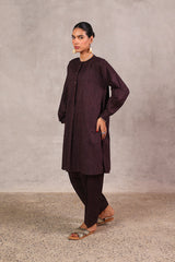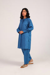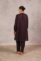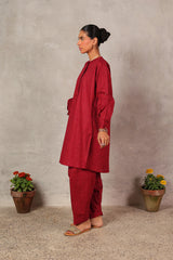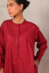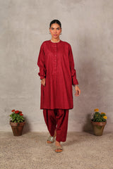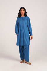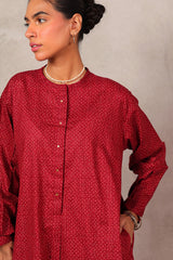 An easy-fit Ajrak-inspired printed kurta featuring a round neckline with subtle mukaish detailing on the front placket. Designed with cuffed sleeves for added structure. Paired with a matching printed classic-fit shalwar for a coordinated, effortless look.