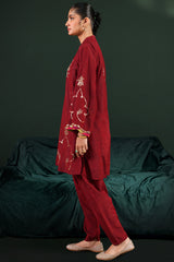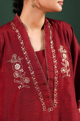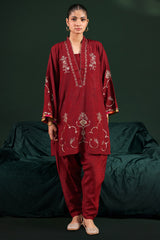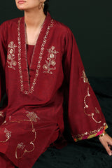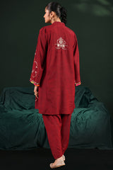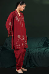 Handcrafted classic-fit paneled kurta with a V-neckline with an insert, adorned with delicate stitching, sequin, and embroidered detailing throughout. Paired with a classic-fit shalwar for a timeless look.